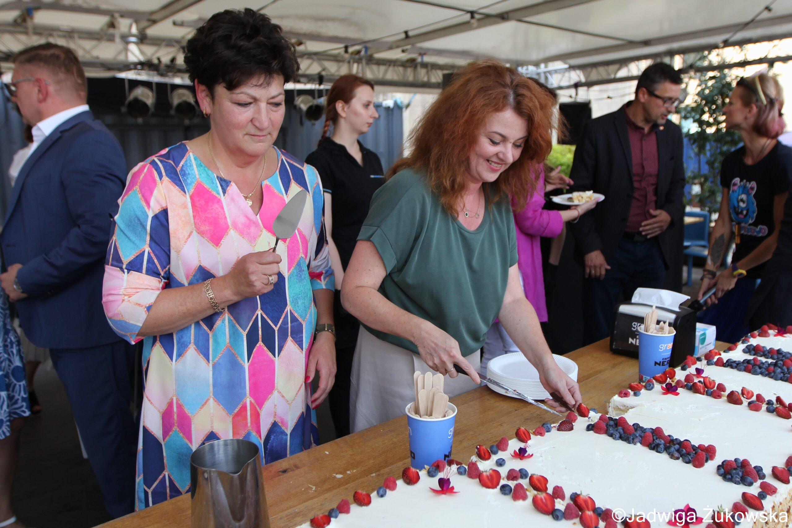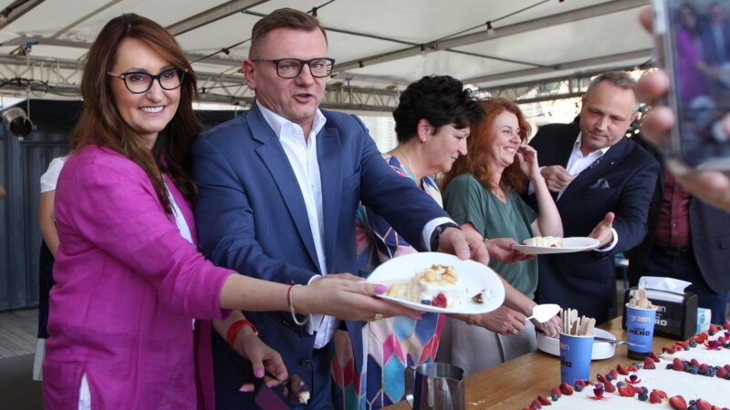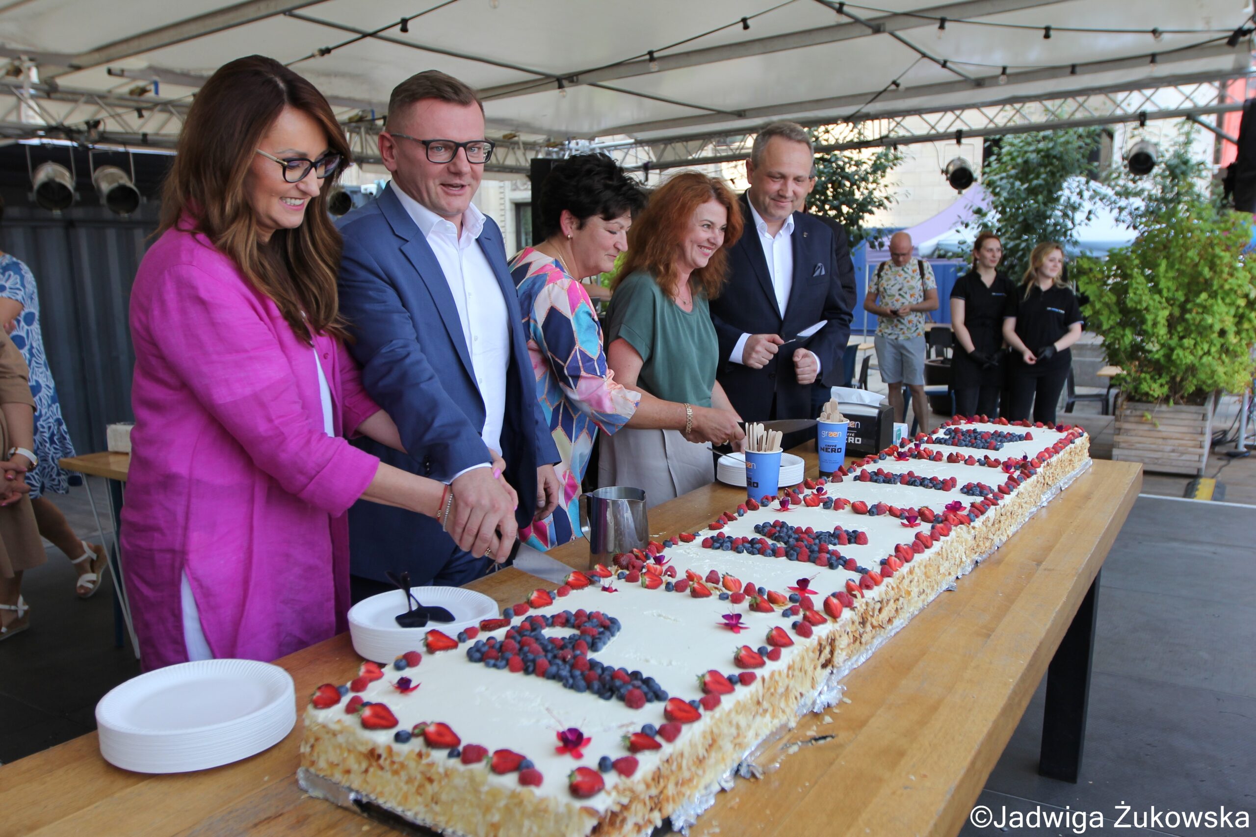 67. Urodziny Pałacu Kultury i Nauki. Tort urodzinowy na placu Defilad dzielą: Renata Kaznowska – wiceprezydent m.st. Warszawy, Rafał Krzemień – prezes zarządu PKiN, Aldona Machnowska-Góra – wiceprezydent m.st. Warszawy, Tomasz Bratek – wiceprezydent m.st. Warszawy. Fot. Jadwiga Żukowska