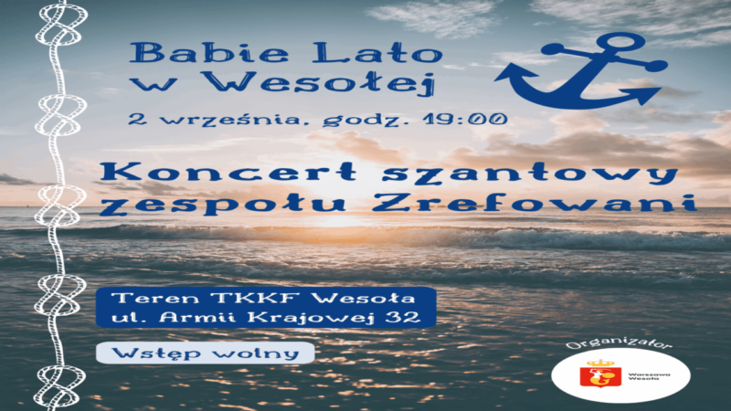 Urząd Dzielnicy Wesoła m.st. Warszawy zaprasza 2 września (sobota) o godz. 19.00 odbędzie się koncert szantowy zespołu Zrefowani na terenie TKKF Wesoła przy ul. Armii Krajowej 32.