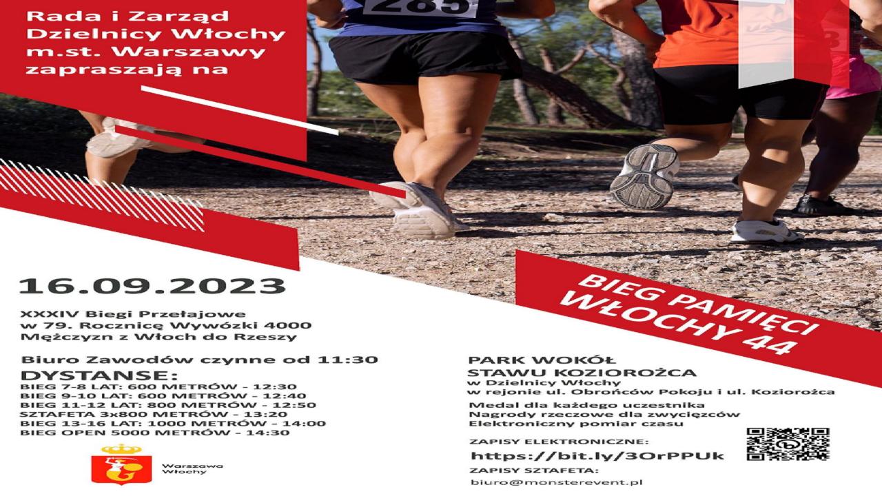 Rada i Zarząd Dzielnicy Włochy serdecznie zapraszają: dzieci, młodzież oraz dorosłych do udziału w „Biegu Pamięci – Włochy 44” w parku wokół Stawu Koziorożca w dniu 16.09.2023 r. i wspólnego upamiętnienia na sportowo tragicznego wydarzenia, jakim była wywózka około 4000 mężczyzn z Włoch do Rzeszy w dniu 16 września 1944 r.