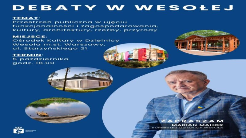 Urząd Dzielnicy Wesoła m.st. Warszawy zaprasza na debaty. Pierwsza debata odbędzie się 5 października 2023 r. o godzinie 18:00 w Ośrodku Kultury w Dzielnicy Wesoła przy ul. Starzyńskiego 21. Jej tematem będzie: „Przestrzeń publiczna w ujęciu funkcjonalności i zagospodarowania, kultury, architektury, rzeźby, przyrody”.