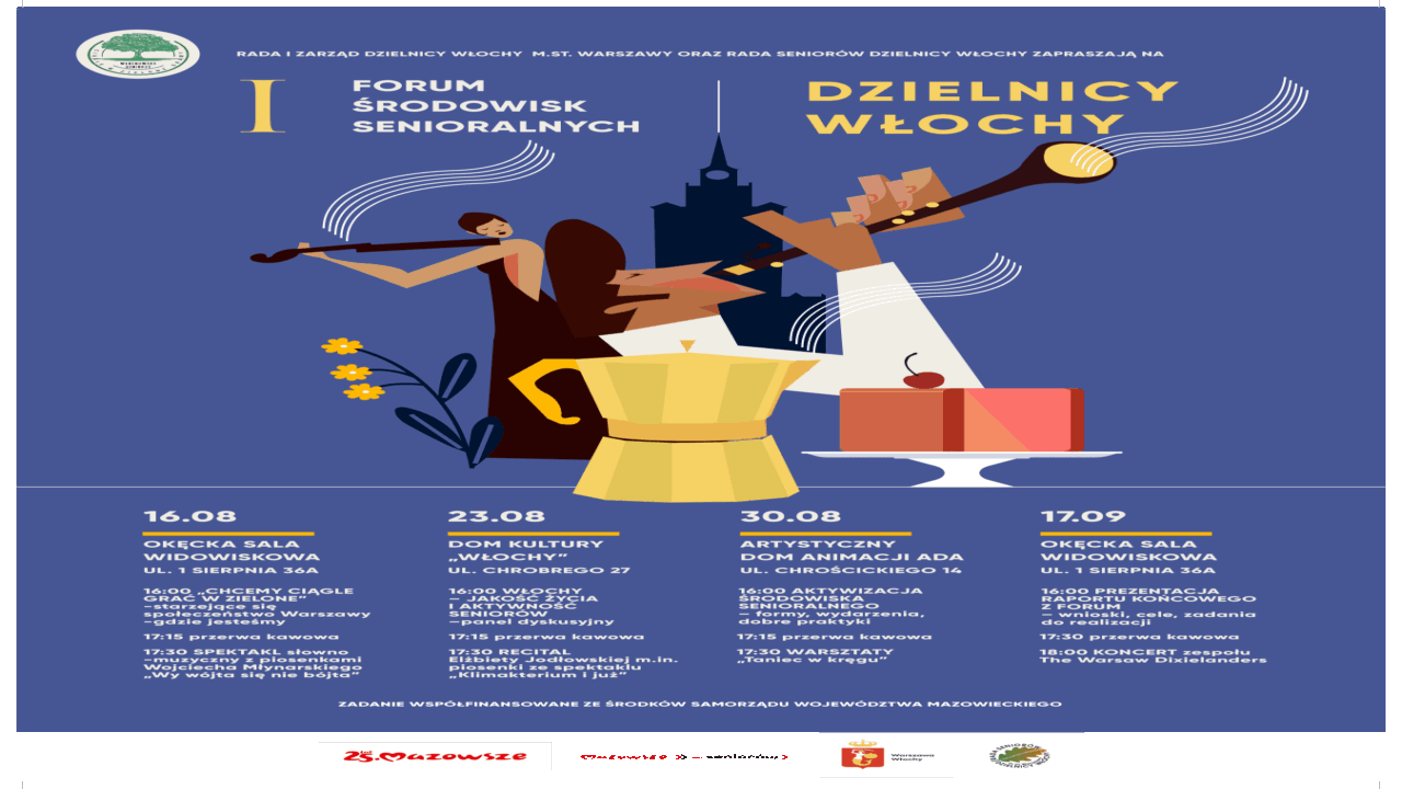 Urząd Dzielnicy Włochy m.st. Warszawy zaprasza wszystkich seniorów na I Forum Środowisk Senioralnych we Włochach, które organizowane jest przez Dzielnicę Włochy oraz Radę Seniorów Dzielnicy Włochy, przy finansowym wsparciu Samorządu Województwa Mazowieckiego.