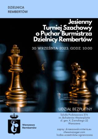 Urząd Dzielnicy Rembertów m.st. Warszawy zaprasza wszystkich, którym gra w szachy sprawia przyjemność na Jesienny Turniej Szachowy o Puchar Burmistrza Dzielnicy Rembertów.