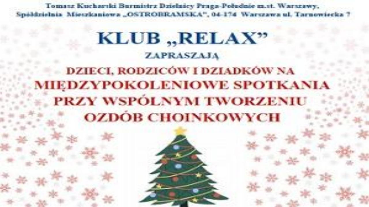 Urząd Dzielnicy Praga-Południe m.st. Warszawy ,Tomasz Kucharski Burmistrz Dzielnicy Praga-Południe m.st. Warszawy, Spółdzielnia Mieszkaniowa ,,Ostrobramska” zapraszają na Międzypokoleniowe spotkania przy wspólnym tworzeniu ozdób choinkowych.