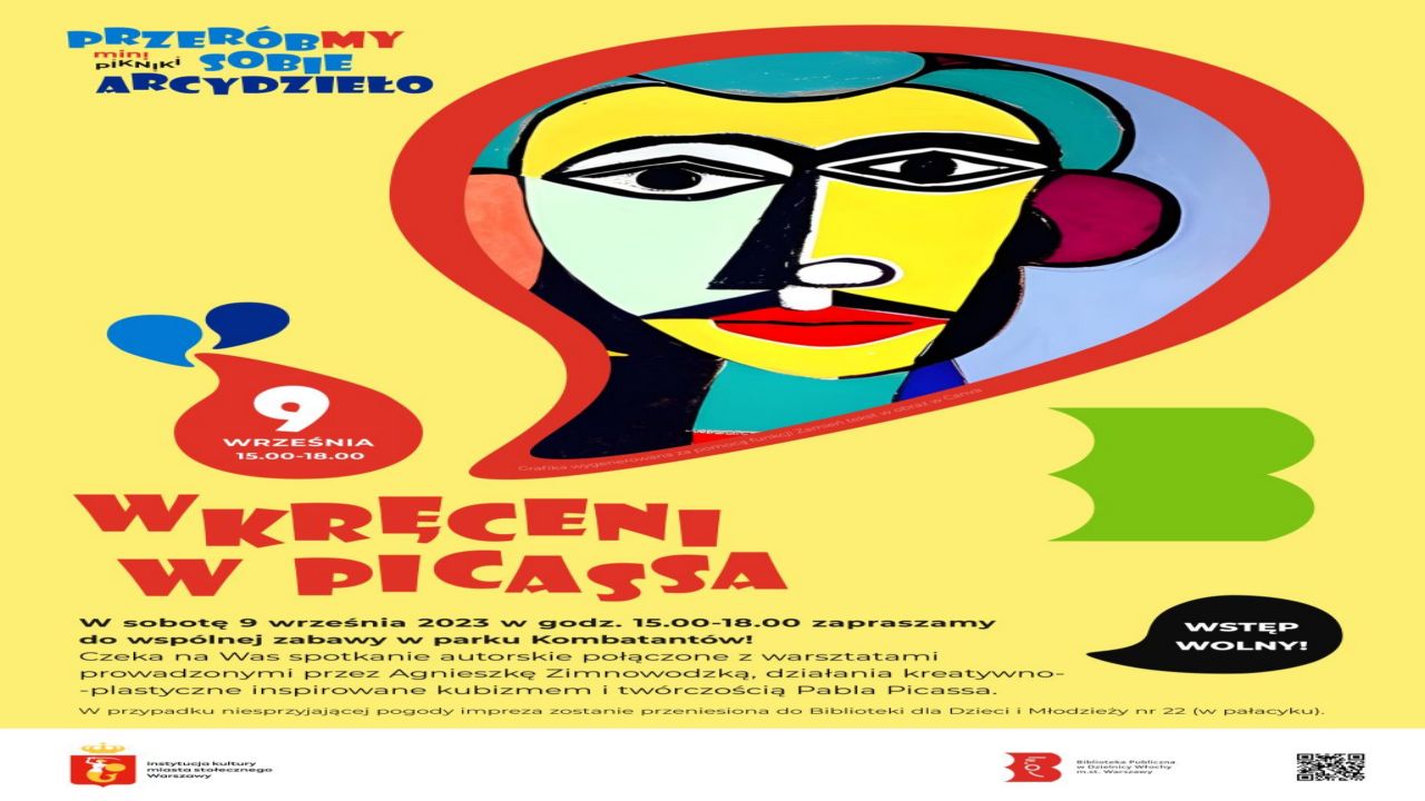 Urząd Dzielnicy Włochy m.st. Warszawy informuje. W sobotę 9 września 2023 w godzinach 15.00-18.00 zapraszamy do wspólnej zabawy w parku Kombatantów podczas pikniku z cyklu Przeróbmy sobie arcydzieło: Wkręceni w Picassa.