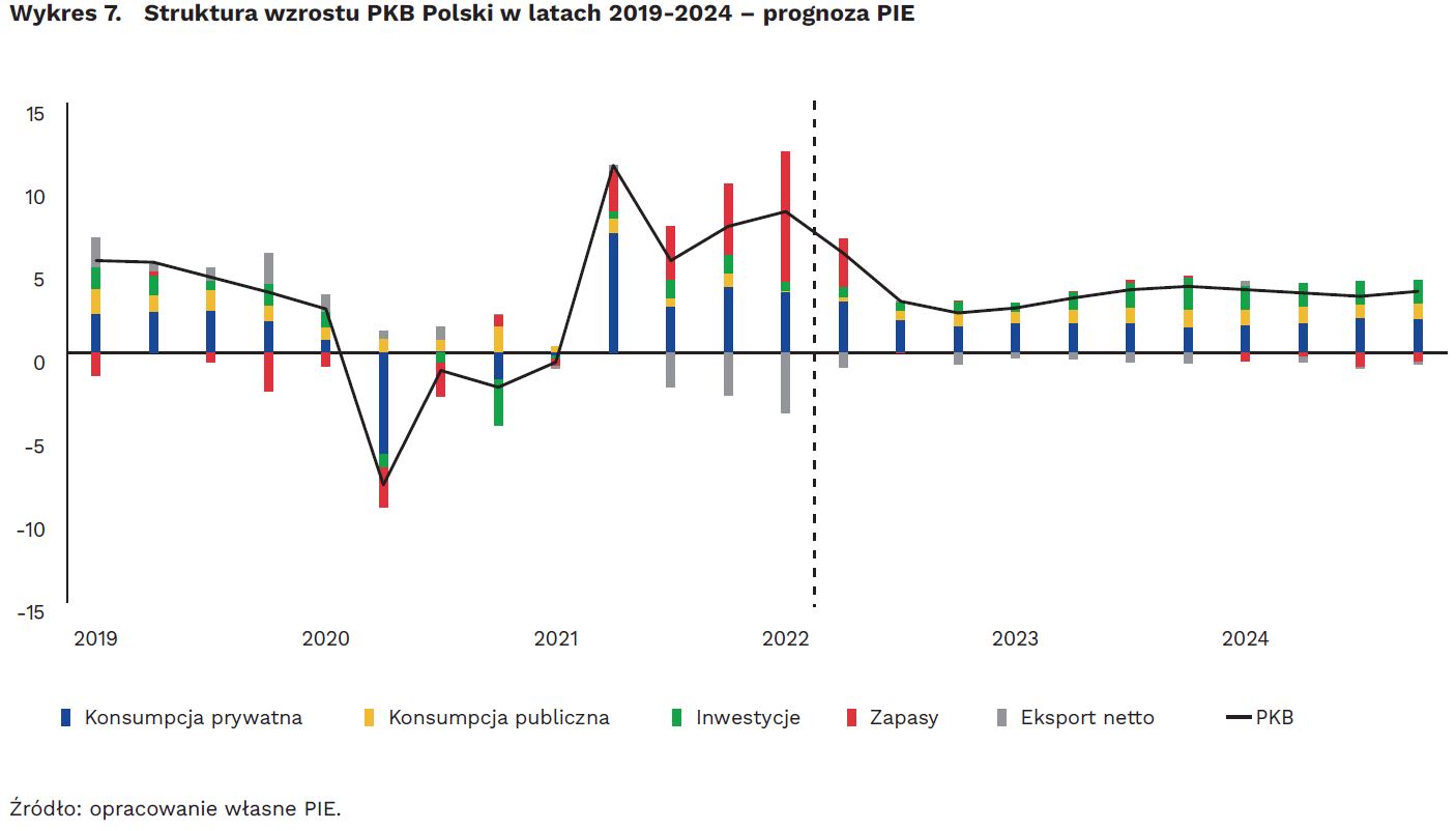Polski Instytut Ekonomiczny prognozuje, że PKB Polski wzrośnie w 2022 r. o 4,8 proc., zaś w 2023 r. o 3,5 proc. Średnia inflacja sięgnie w tym roku 13,1 proc. ze szczytem na poziomie 15,8 proc. w sierpniu.