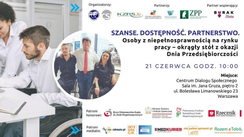 Zapraszamy na wyjątkową debatę na temat współpracy międzyśrodowiskowej na rzecz integracji zawodowej osób niepełnosprawnych pt. „Szanse. Dostępność. Partnerstwo. Osoby z niepełnosprawnością na rynku pracy – okrągły stół z okazji Dnia Przedsiębiorczości”.
