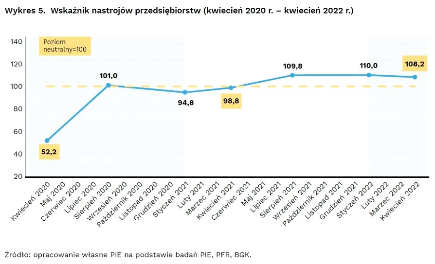 Polski Instytut Ekonomiczny porównał nastroje i reakcje przedsiębiorców z trzech momentów będących szokami zewnętrznymi dla firm: początku pandemii COVID-19 w 2020 r., jej szczytu z kwietnia 2021 r. oraz krótko po inwazji Rosji i Białorusi na Ukrainę. Okazuje się, że początek pandemii był wyjątkowym szokiem dla polskich przedsiębiorstw, wskaźnik nastrojów osiągnął wówczas bardzo niski poziom 52,2 pkt., co oznacza znaczną przewagę nastrojów negatywnych nad pozytywnymi. Tak widocznego pogorszenia nastrojów nie było rok później, mimo dużej liczby zachorowań i surowych restrykcji covidowych. Podobnie, wyraźnego szoku nie przyniosła rosyjska inwazja na Ukrainę. Jednak wybuch wojny za wschodnią granicą sprawił, że niepewność sytuacji gospodarczej znowu była wskazywana jako najważniejsza bariera działalności gospodarczej – wynika z raportu PIE „Szok pandemiczny, szok wojenny, czyli jak firmy reagują na kryzysy”.