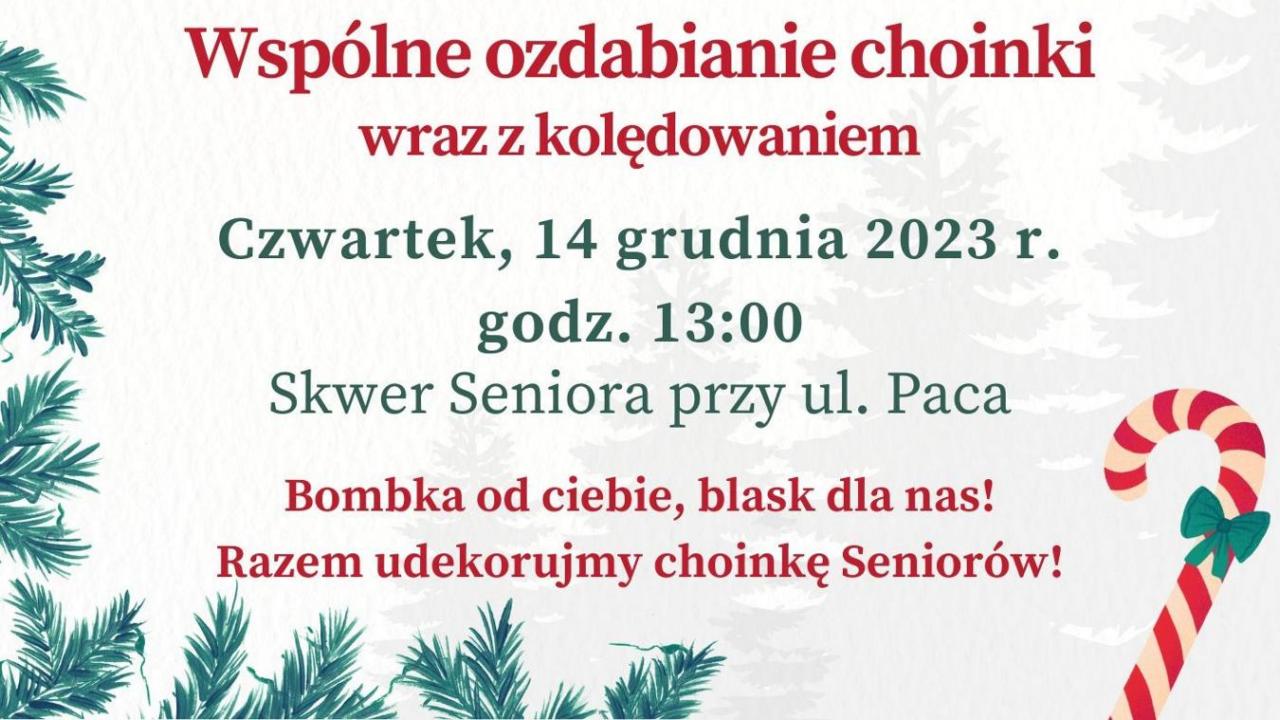 Urząd Dzielnicy Praga-Południe m.st. Warszawy informuje.Rada Seniorów oraz Tomasz Kucharski Burmistrz Dzielnicy Praga-Południe m.st. Warszawy zapraszają na Wspólne ozdabianie choinki wraz z kolędowaniem. Czwartek, 14 grudnia 2023 r. godz. 13:00 Skwer Seniora przy ul. Paca, Bombka od ciebie, blask dla nas! Razem udekorujmy choinkę Seniorów!