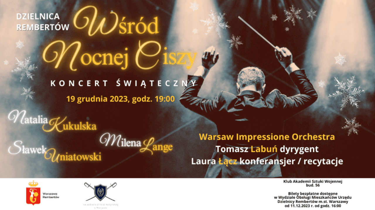Urząd Dzielnicy Rembertów m.st. Warszawy informuje. 19 grudnia 2023 o godzinie 19:00 na scenie Klubu Akademii Sztuki Wojennej wystąpią: Natalia Kukulska, Milena Lange, Sławek Uniatowski oraz Warsaw Impressione Orchestra pod batutą Tomasza Labunia. Wydarzenie poprowadzi Laura Łącz.