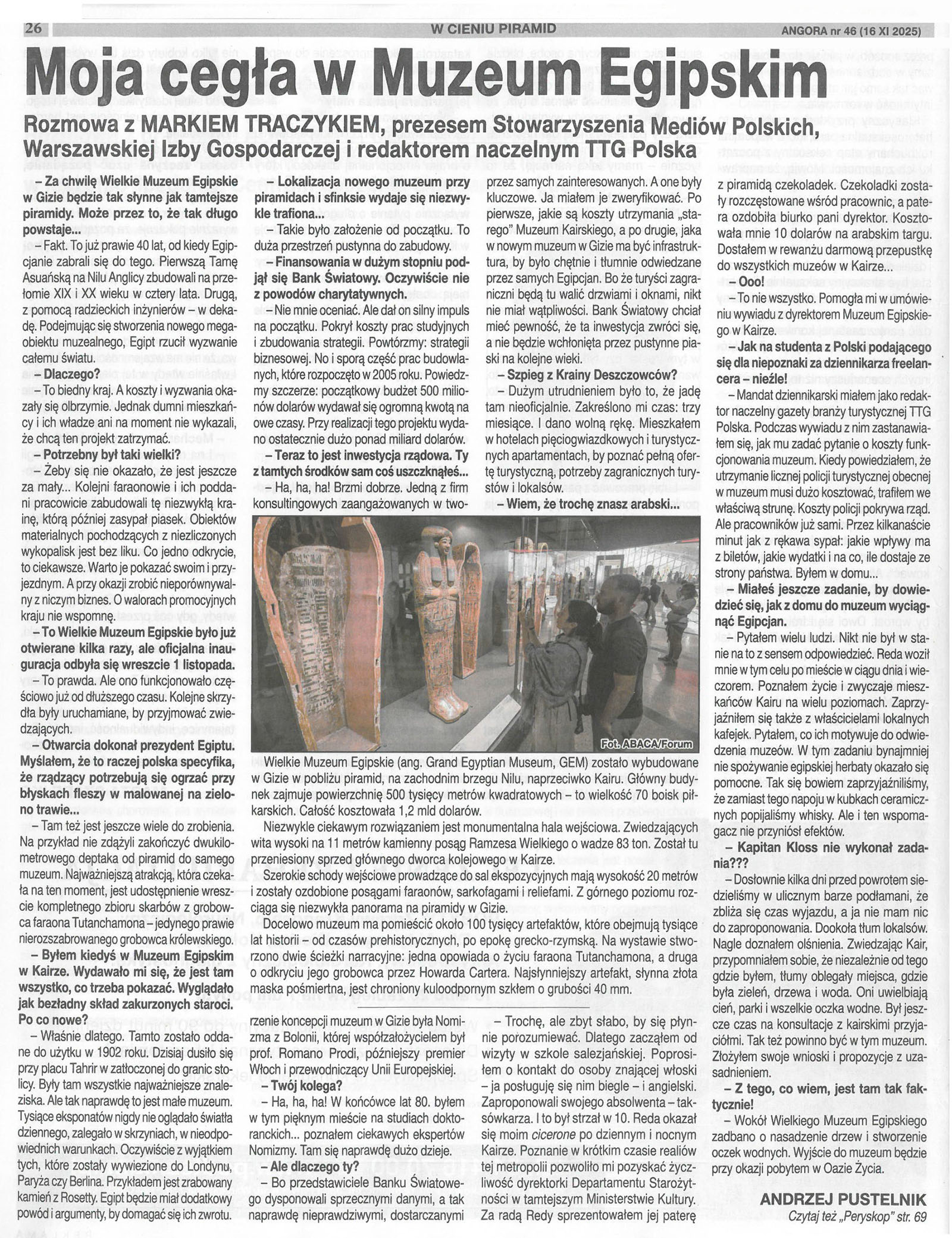 Wywiad z Markiem Traczykiem, redaktorem naczelnym TTG Polska, dotyczący jego wkładu na rzecz Wielkiego Muzeum Egipskiego.